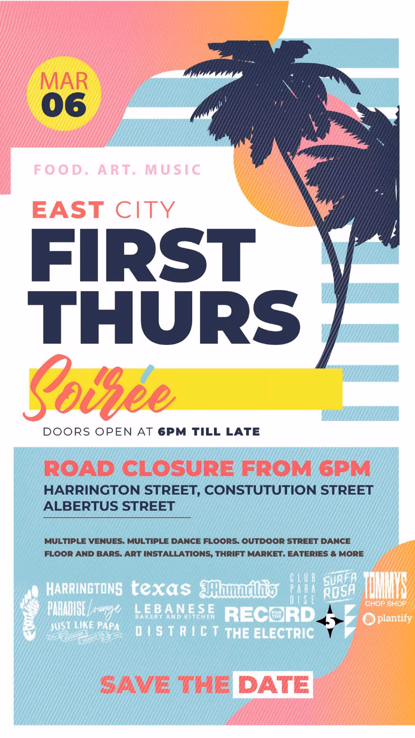 Experience First Thursday in the East City Precinct. We want everyone to experience the one-of-a-kind vibe so entry will be FREE.